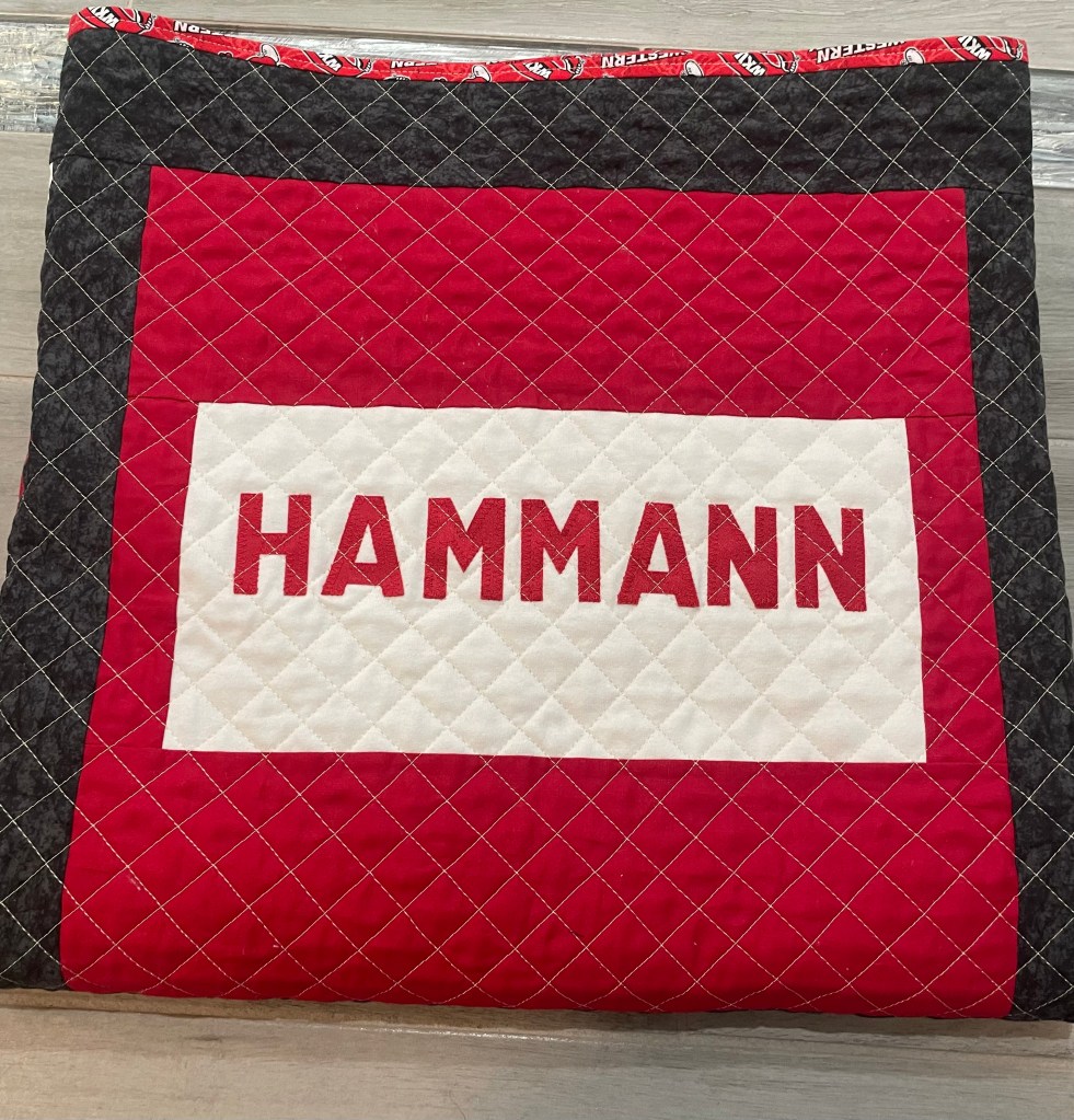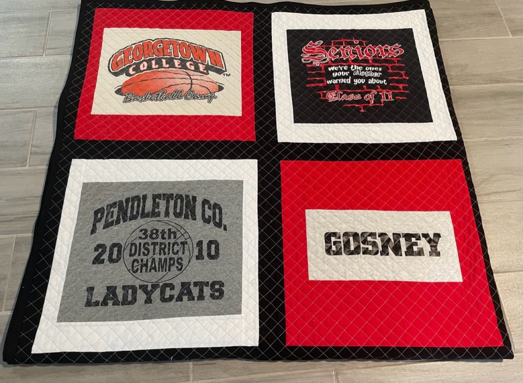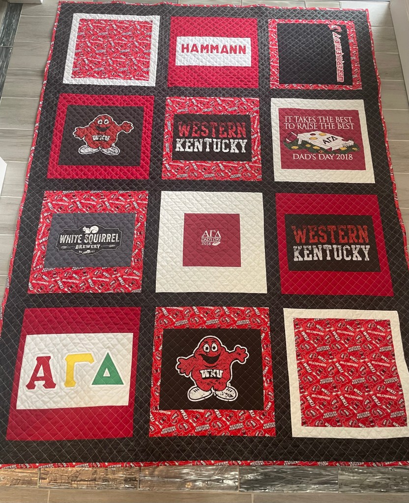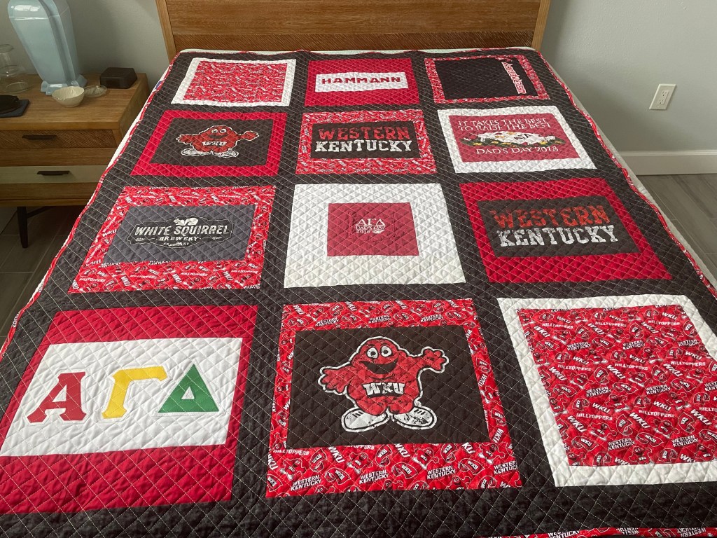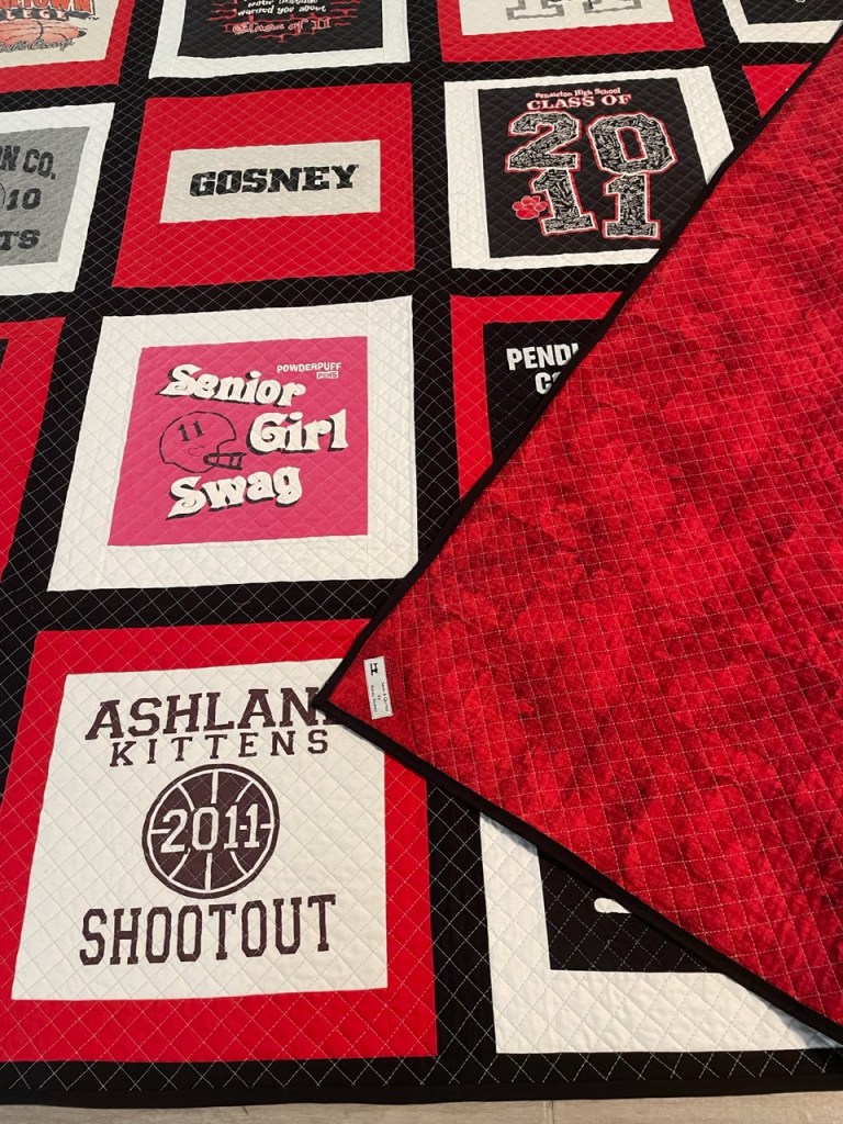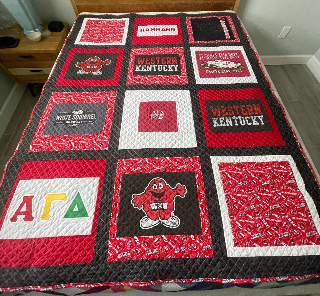 Have you been saving t-shirts that hold special memories for either you or someone else? A T-Shirt Memory Quilt is the perfect way for you or your loved ones to cherish those special memories. These quilts were made with t-shirts that were handpicked to memorialize special times in the each recipients life. The size of the quilt can be customized based on the size and number of t-shirts that you choose to include. You can also choose the background colors for the squares and the sashing that surrounds each square.