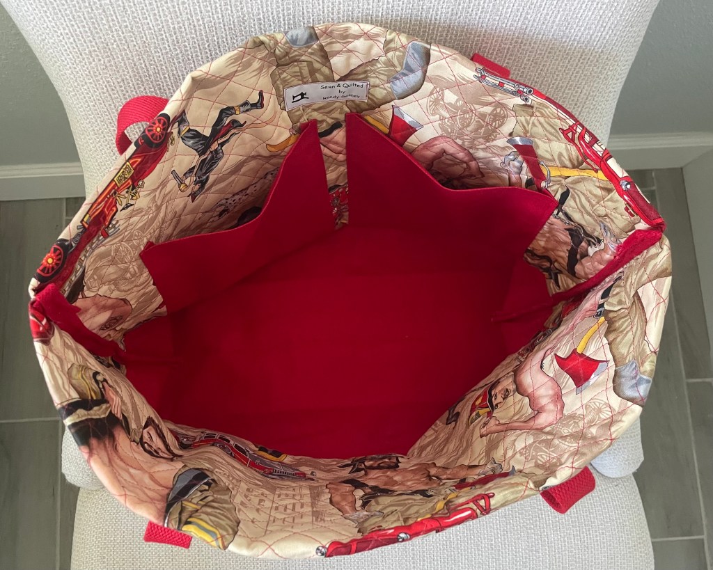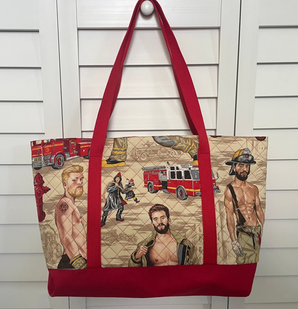 Our “Feel the Heat” Quilted Tote Bag is made from fabric designer Alexander Henry’s Pin-up line. This bag is sure to be a conversation starter no matter where you take it – whether using it for a day at the beach or out running errands. This roomy tote bag measures 19” wide by 12” high (not including the handles) and a depth of 5” and has two interior pockets for easy access to your keys, phone, sunglasses, etc.